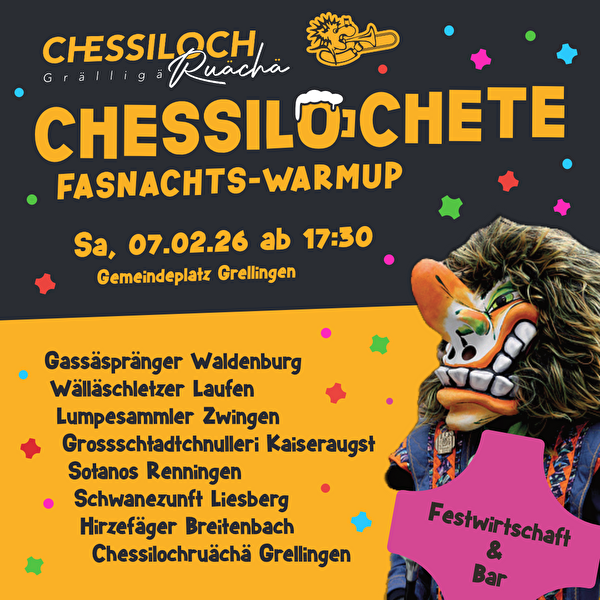 Hoi zusammen! Die Guggenmusik Chessilochruächä Grellingen laden euch wieder herzlich zur nächsten Ausgabe des Fasnachts-Warmup Chessilochete ein.